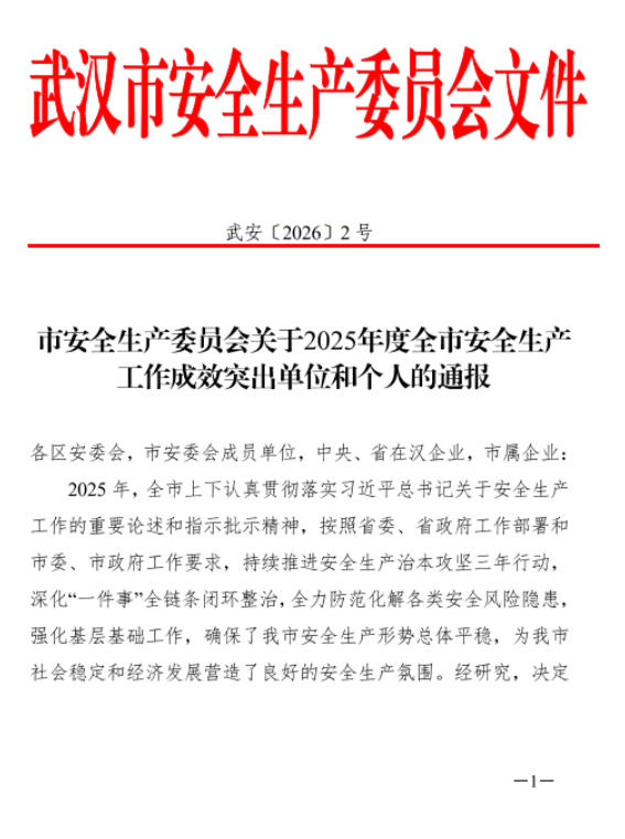 此次獲評(píng)市級(jí)安全生產(chǎn)工作成效突出單位,是公司繼2024年獲評(píng)“武漢市安全生產(chǎn)優(yōu)秀單位”、2025年項(xiàng)目管理部獲武漢市“安全生產(chǎn)先進(jìn)班組”后的又一項(xiàng)重要榮譽(yù)。多項(xiàng)榮譽(yù)的取得,充分彰顯了公司在安全生產(chǎn)領(lǐng)域的標(biāo)準(zhǔn)化管理水平與扎實(shí)工作成效。