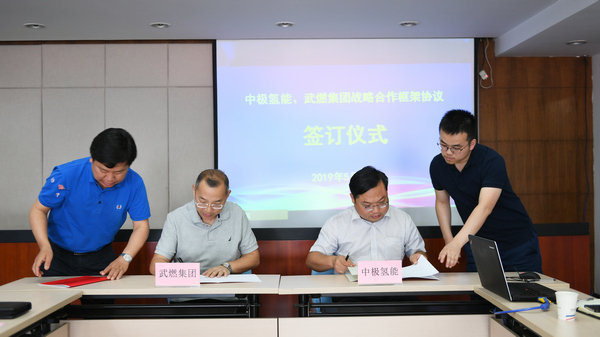 2019年5月23日,市燃?xì)饧瘓F(tuán)公司與武漢中極氫能源發(fā)展有限公司在集團(tuán)公司功能會議室簽署戰(zhàn)略合作協(xié)議。簽約儀式由集團(tuán)公司董事張正發(fā)主持,董事長汪志勇和相關(guān)單位和部門負(fù)責(zé)人,以及武漢地質(zhì)資源環(huán)境工業(yè)技術(shù)研究院董事長郝義國、武漢中極氫能源發(fā)展有限公司總經(jīng)理李強(qiáng)等相關(guān)人員出席簽約儀式。