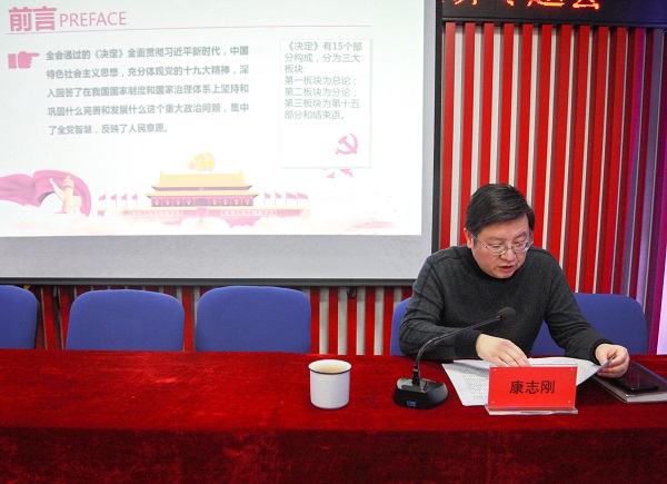 為開展好宣講活動,集團公司專門成立宣講組,由黨委書記汪志勇同志任宣講組組長,帶頭在集團本部開展宣講,領(lǐng)導(dǎo)班子其他成員到各對口單位集中開展宣講。宣講組成員就堅持和完善中國特色社會主義制度、推進國家治理體系和治理能力現(xiàn)代化的重大意義;中國特色社會主義制度和國家治理體系的顯著優(yōu)勢,堅定中國特色社會主義制度自信;堅持和完善中國特色社會主義制度、推進國家治理體系和治理能力現(xiàn)代化的總體要求、總體目標和重點任務(wù);加強黨的領(lǐng)導(dǎo),確保全會確定的各項目標任務(wù)全面落實到位等四個方面為大家做了詳細宣貫。宣講組成員還結(jié)合所分管的單位工作實際展開了研討,加深了全體干部職工對全會精神的學(xué)習(xí)領(lǐng)悟和理解把握。