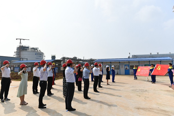 活動在雄壯的國歌聲中拉開序幕,集團公司黨委書記、董事長汪志勇同志、國開行客戶二處處長何才明同志分別致辭。全體黨員在參加升旗儀式、重溫入黨誓詞后,實地參觀了安山儲氣庫擴建項目施工現(xiàn)場以及安山氣庫工藝區(qū)。