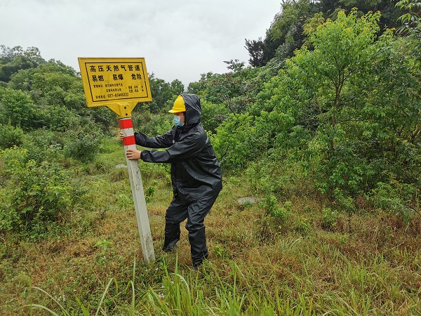 高壓管網(wǎng)公司巡線員巡查過程中,發(fā)現(xiàn)大雨導(dǎo)致土質(zhì)疏松,造成警示樁傾斜,立即上前扶正,有效處理了一處小隱患。