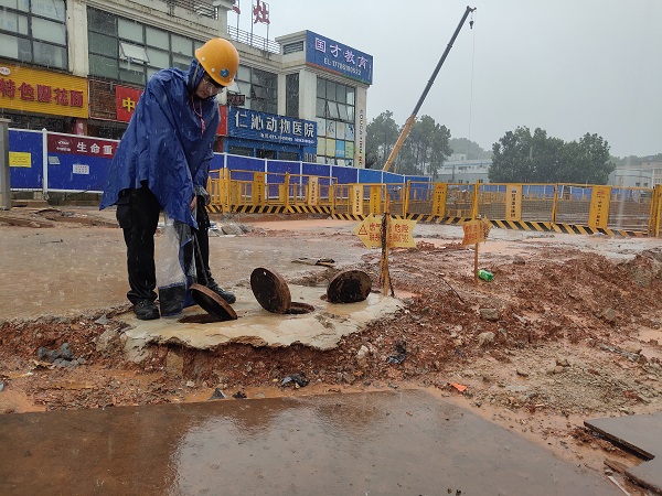 天然氣公司搶修中心員工暴雨中搶修楊春湖井室漏氣。